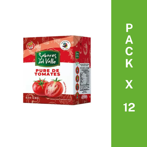 Pack cerrado de 12 unidades de pure de tomates marca Sabores del Valle